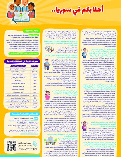 يُعدّ الحصول على التعليم خطوةً أساسيةً نحو إعادة بناء الحياة وضمان مستقبلٍ أفضل. يُقدّم هذا القسم معلوماتٍ جوهريةً للعائلات والشباب العائدين إلى سوريا، بما في ذلك إرشاداتٍ حول إجراءات التسجيل في المدارس، ومتطلبات الوثائق، وخيارات التعلّم البديلة للأطفال الذين انقطعوا عن الدراسة. ستجدون أيضًا تفاصيلَ حول برامج المراهقين والشباب، مثل التدريب المهني، ومهارات الحياة، وأنشطة المشاركة المجتمعية، بالإضافة إلى فرص الانضمام إلى نوادي الشباب والمبادرات الثقافية. استكشفوا الموارد أدناه للمساعدة في ضمان استمرار كل طفل وشاب في التعلّم والنمو.